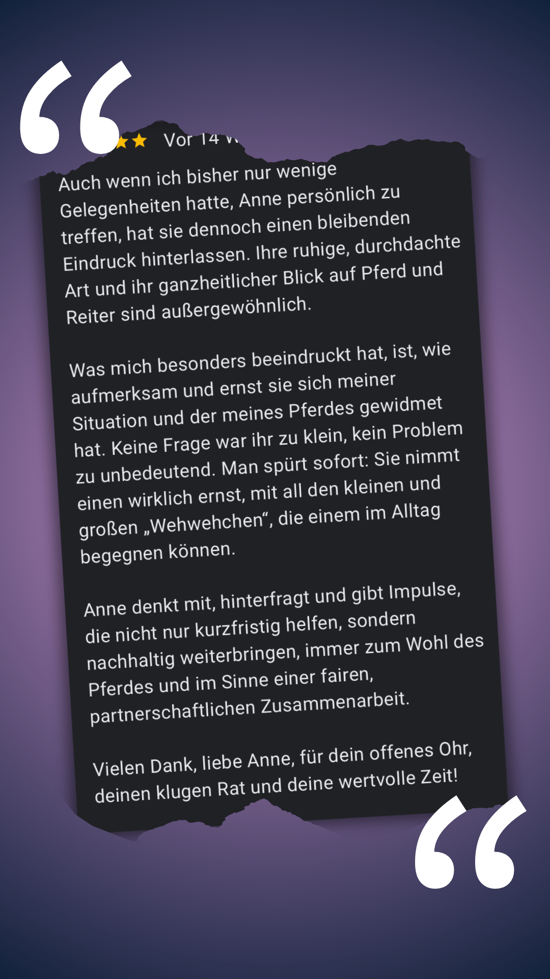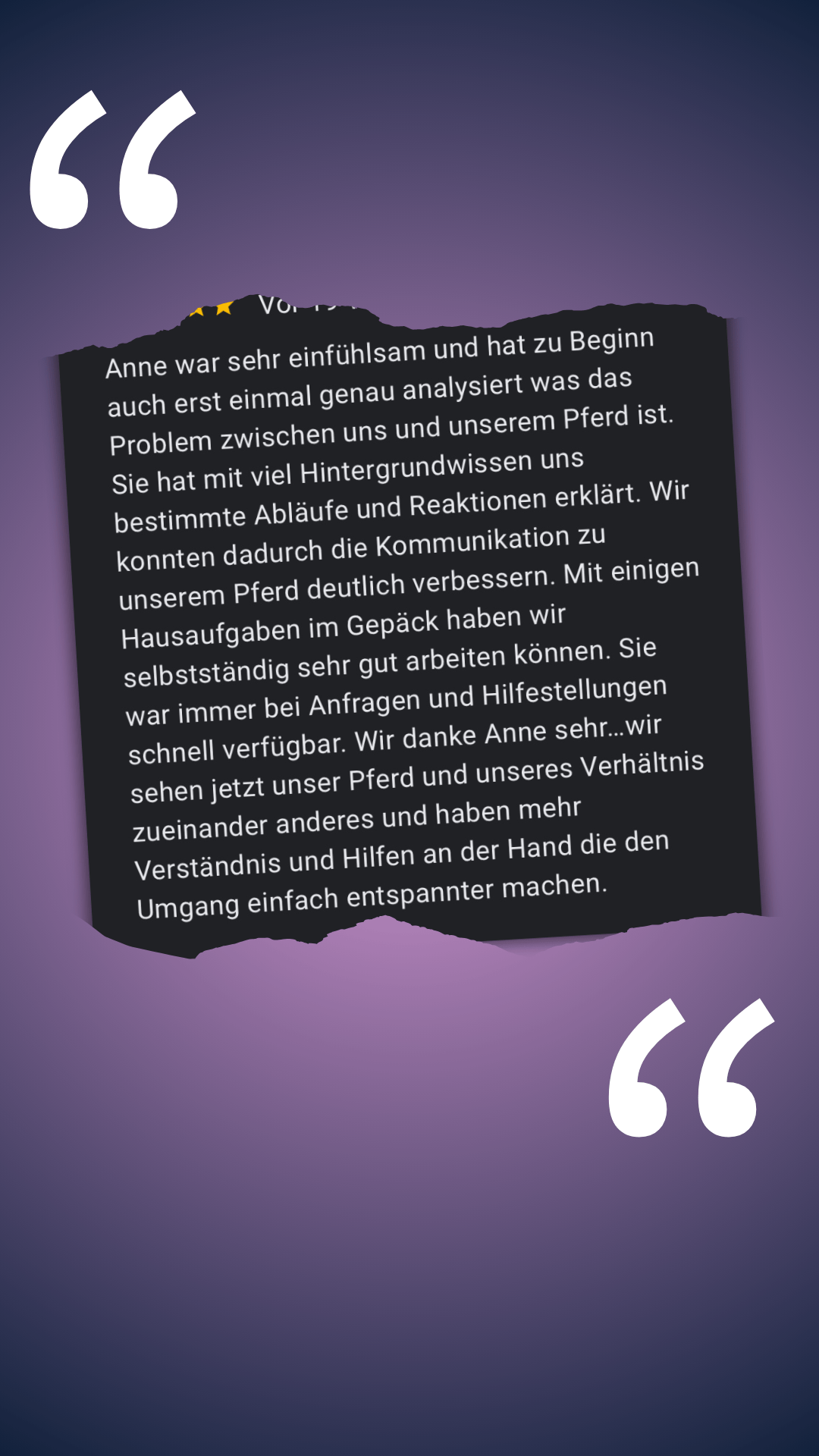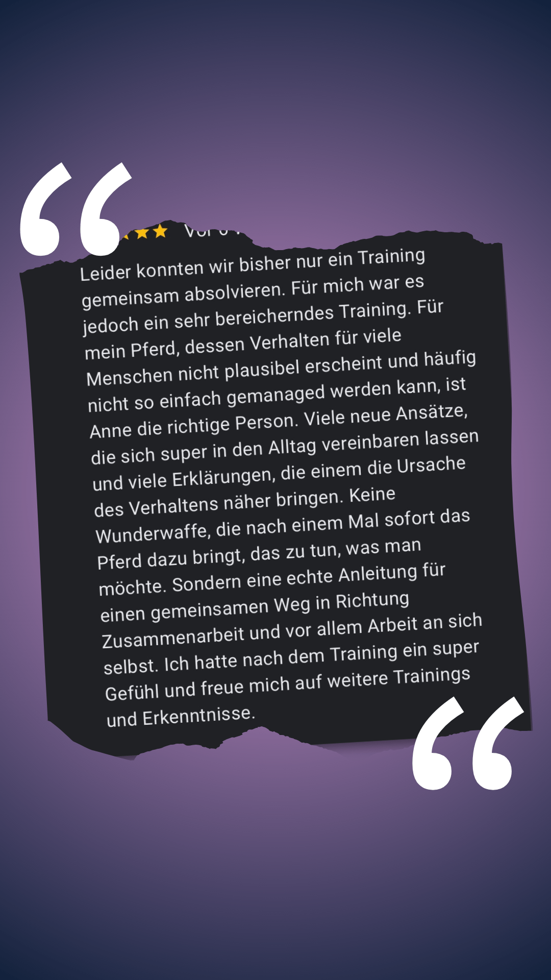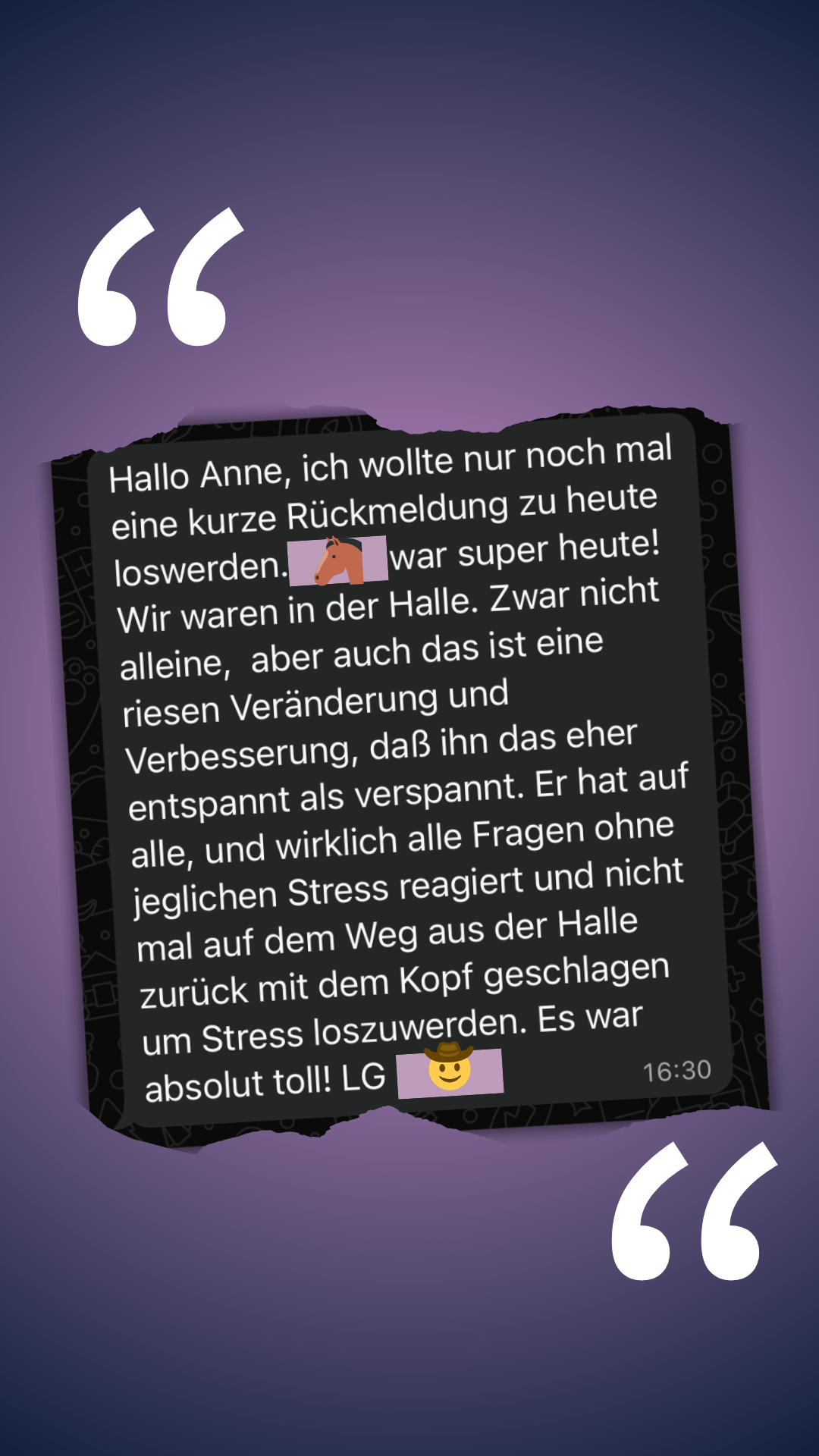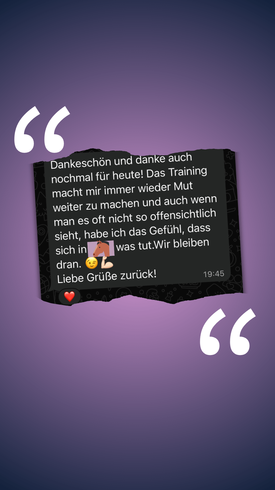 Nachhaltige Veränderung passiert nicht über Nacht. Wenn du jedoch bereit bist, an den Ursachen statt an Symptomen zu arbeiten, dann bist du hier richtig. Melde dich, um zusammen eine tragfähige Lösung für dich und dein Pferd zu entwickeln.